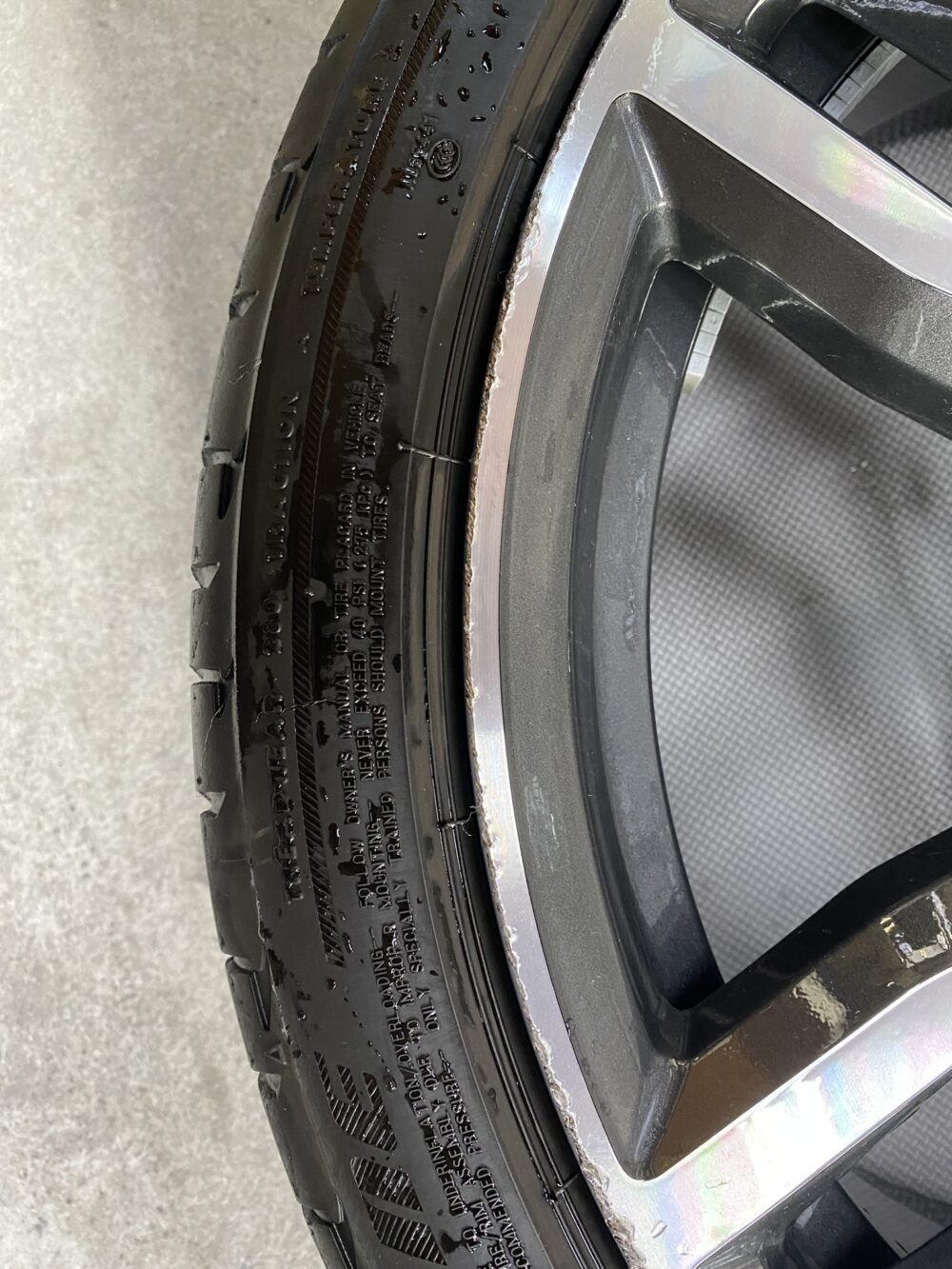 損傷状態は、リム約半周と広範囲で傷も深いところがあるので、お客様には、通常の施工方法である「ダイヤカット再切削」をおすすめしましたが、ご予算と納期で検討された結果、簡易的に修理する「塗装仕上げ」でご対応しています。