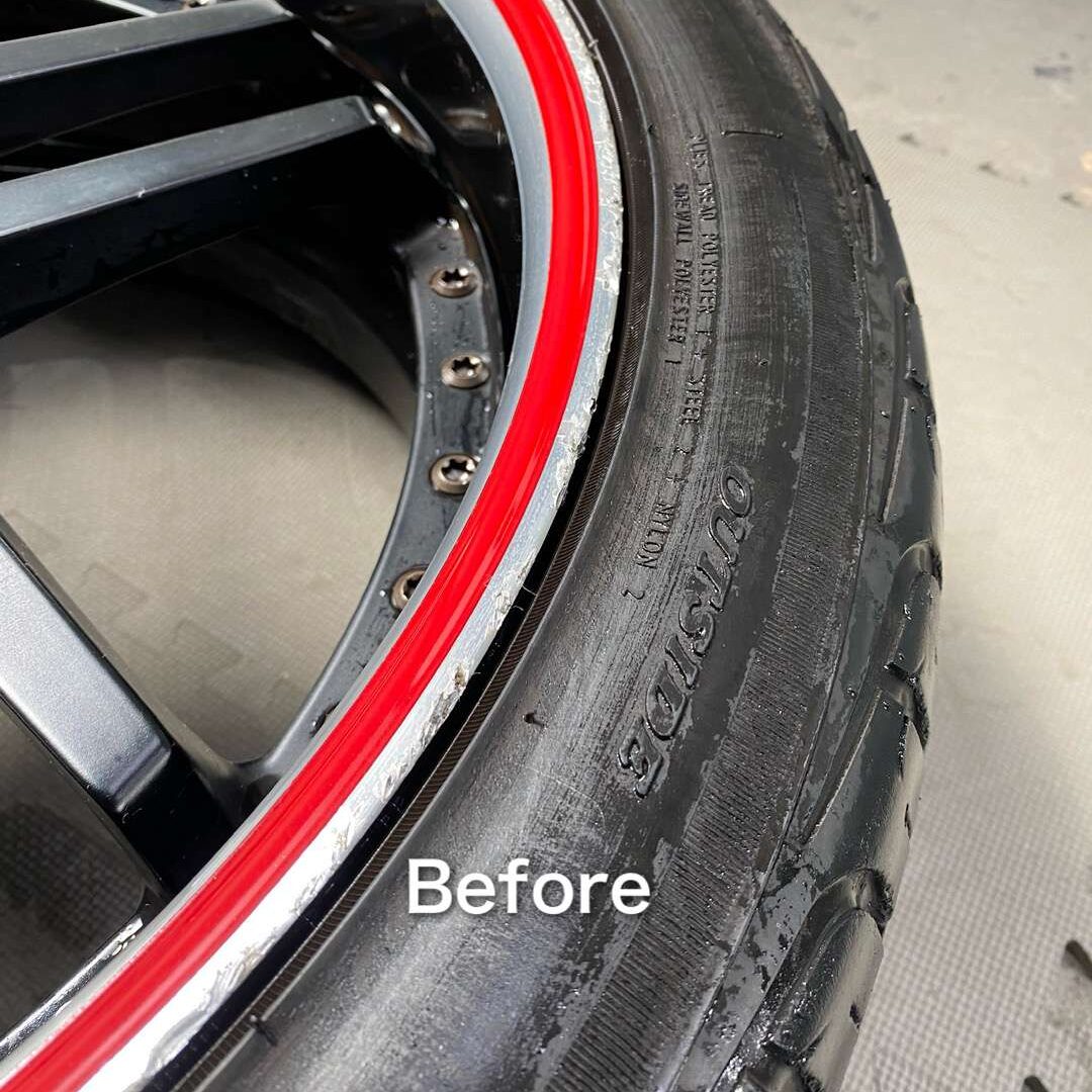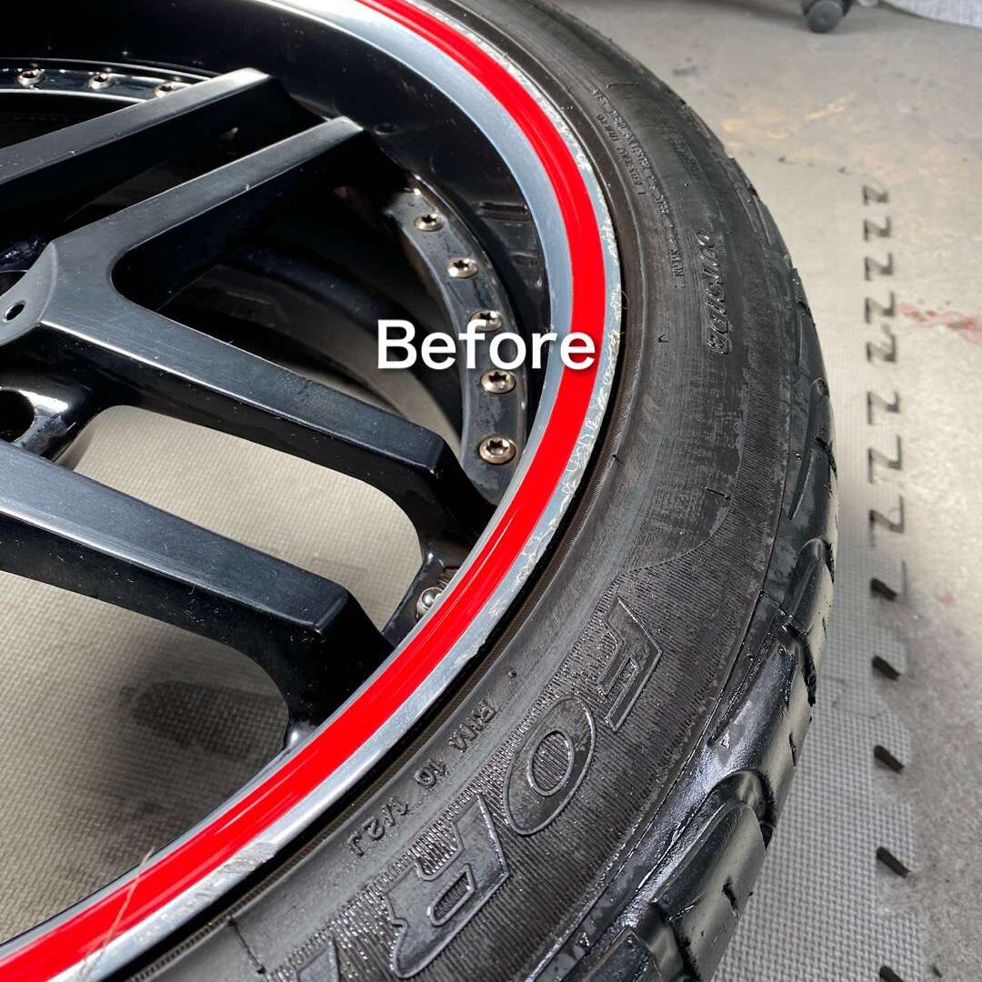 ホイールは、なかなかハデですね。リムには赤いラインが入っています。お見積り時に拝見した時は、この赤いラインは塗装かと思いきや・・・貼りものでした。