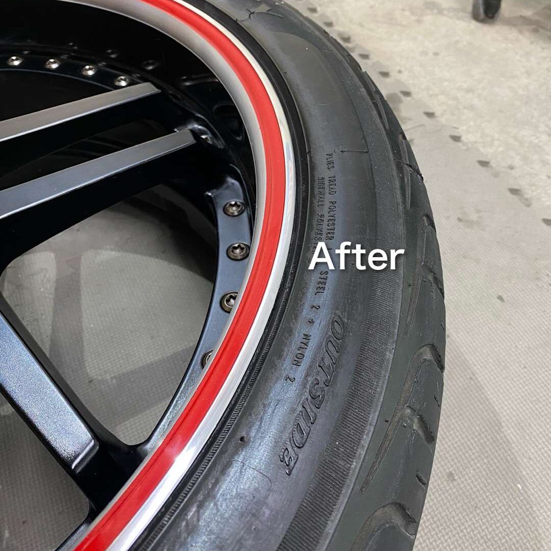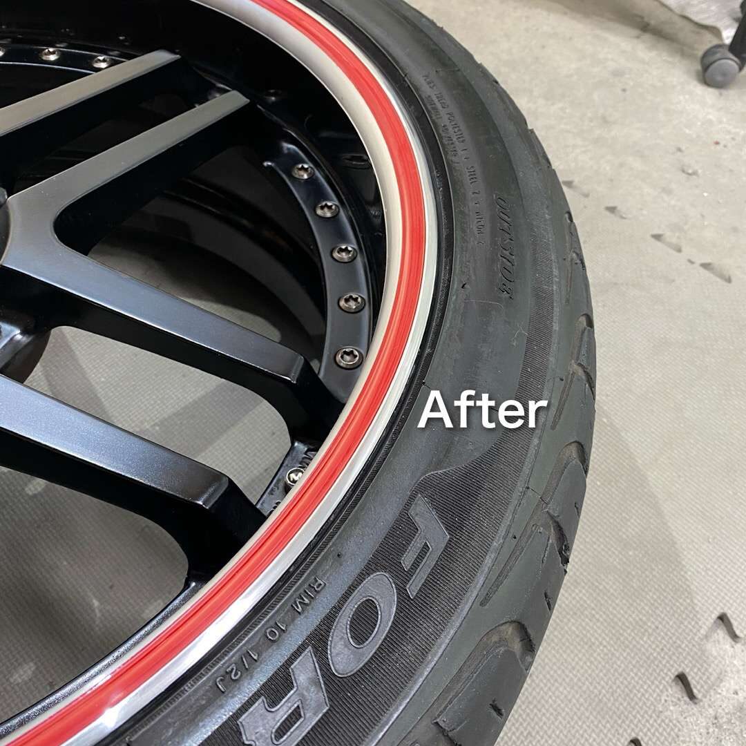 こちら↓が施工後です。ガリ傷は、ギリギリ赤いラインにはみ出していないので、なんとか赤いラインは生かされました。こちらは、ガリ傷を削って取り除き、磨きで仕上げいます。